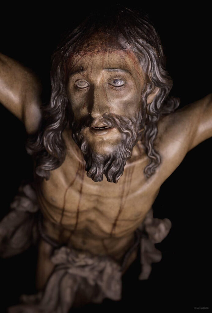 Il Cristo è rappresentato con gli occhi ancora aperti, rivolti al cielo. Lo sguardo cattura il momento dell’ultima invocazione al Padre, in un’espressione di tale potenza e dolore che pare trasmettere al fedele tutta l’intensità della Passione nel suo culmine.